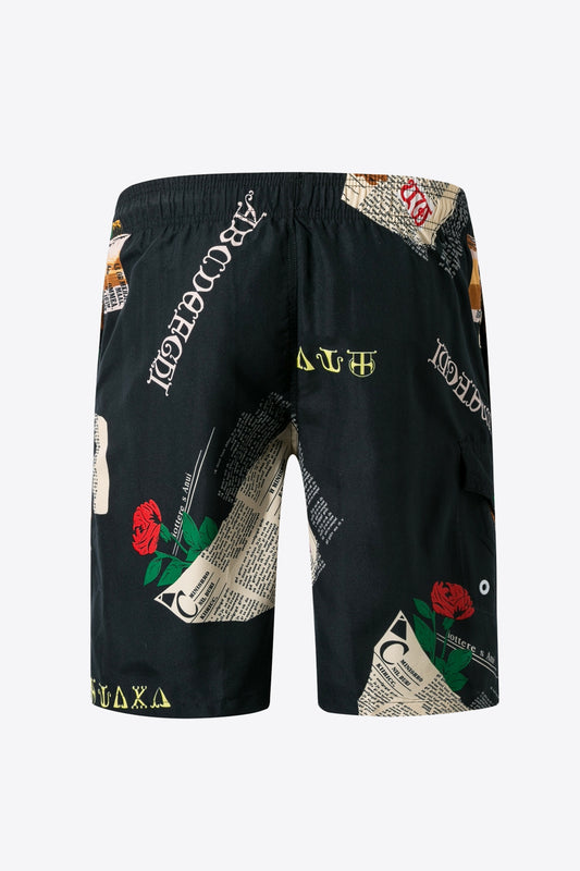 Full Size Newspaper Print Drawstring Waist Swim Trunks