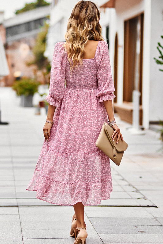 Leopard Square Neck Flounce Sleeve Midi Dress