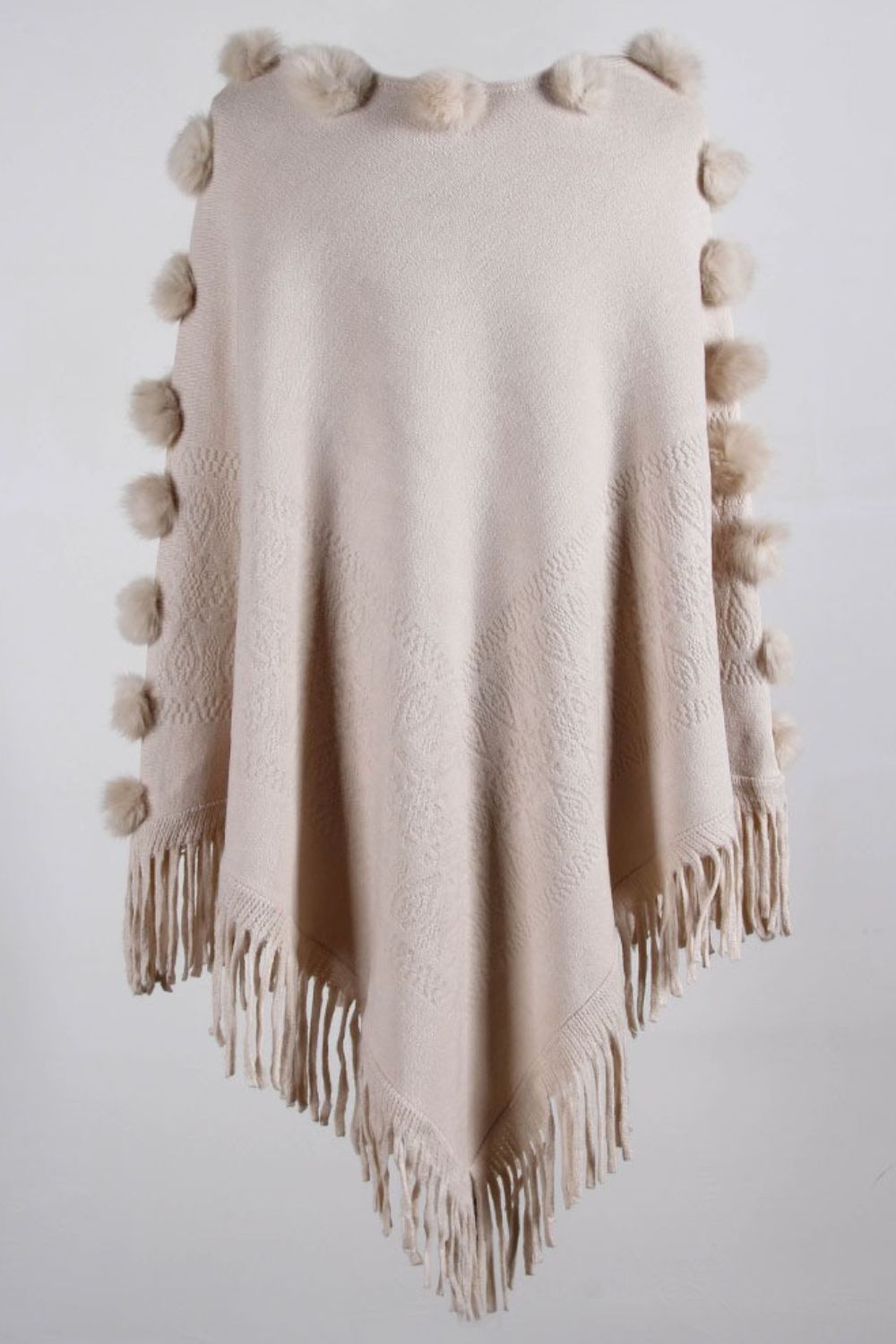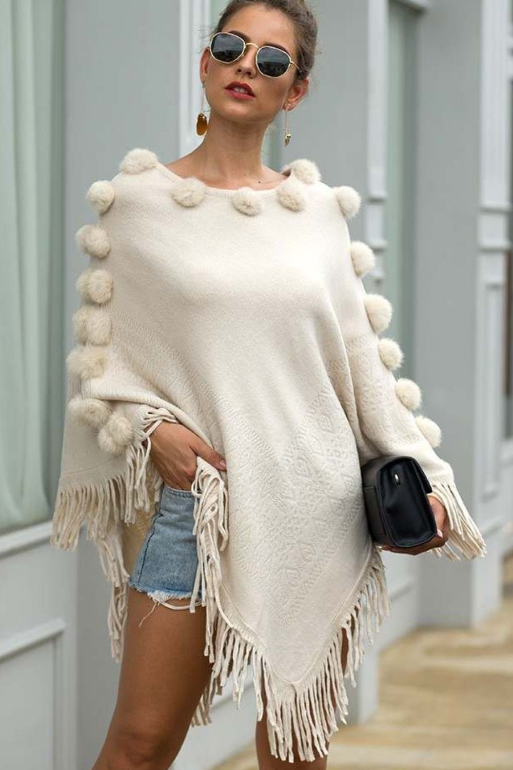 Pompom Trim Boat Neck Fringe Hem Poncho